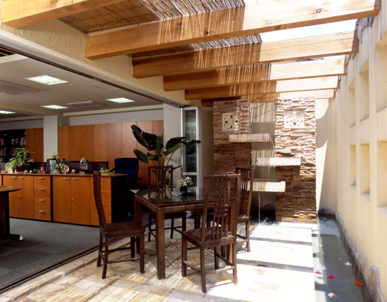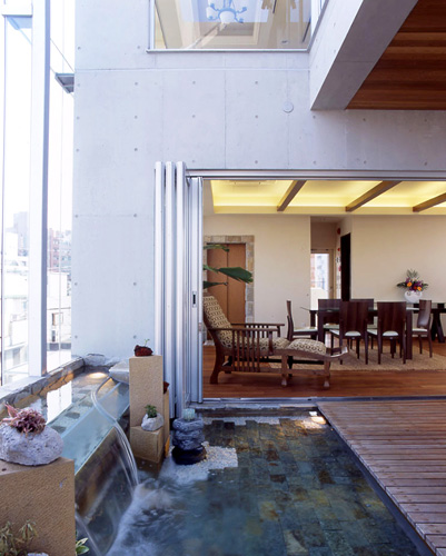 そこで、フレームレスのカーテンウォールでファザードを覆い、内なる光を外へ向け発する「宝石箱」をつくった。内部には緑が揺れ、水が流れ、光がたわむれる庭をつくり、自然が生み出すエネルギーを込めた。
