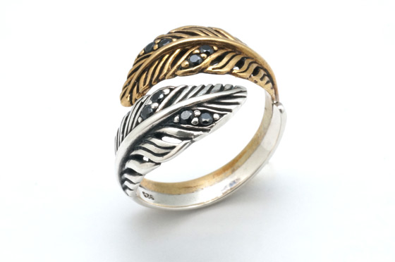 ▲シルバーとブラス素材の2連風のリング。ブラックスピネルが埋め込まれています。