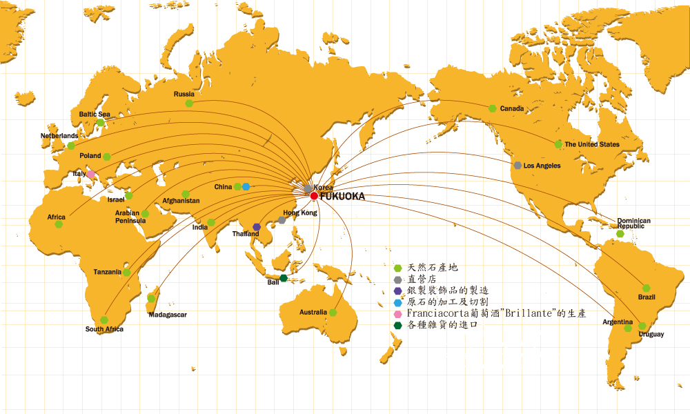 在總裁中村泰二郎的帶領下,我們的工作人員日以繼夜地在世界各地工作。我們在全球範圍內購買來自世界各地的寶石來發展我們的業務和在海外經營海外商店。我們也與不同國家的名人合作,以便能更有效地向整個世界傳輸達石頭的能量和光輝。我們不斷地追求從一塊石頭中可洐生出來的機會。